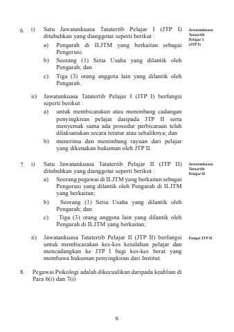 6Jawatankuasa Tataertib Pelajar 1 (JTP I)Jawatankuasa Tataertib Pelajar IIFungsi JTP II6. i) Satu Jawatankuasa Tatatertib Pelajar I (JTP I) ditubuhkan yang dianggotai seperti berikut :a) Pengarah di ILJTM yang berkaitan sebagai Pengerusi;b) Seorang (1) Setia Usaha yang dilantik oleh Pengarah; danc) Tiga (3) orang anggota lain yang dilantik oleh Pengarah.ii) Jawatankuasa Tatatertib Pelajar I (JTP I) berfungsi seperti berikut :a) untuk membicarakan atau menimbang cadangan penyingkiran pelajar daripada JTP II serta menyemak sama ada prosedur perbicaraan telah dilaksanakan secara teratur atau sebaliknya; danb) menerima dan menimbang rayuan dari pelajar yang dikenakan hukuman oleh JTP II.7. i) Satu Jawatankuasa Tatatertib Pelajar II (JTP II) ditubuhkan yang dianggotai seperti berikut :a) Seorang pegawai di ILJTM yang berkaitan sebagai Pengerusi yang dilantik oleh Pengarah di ILJTM yang berkaitan;b) Seorang (1) Setia Usaha yang dilantik oleh Pengarah; danc) Tiga (3) orang anggota lain yang dilantik oleh Pengarah di ILJTM yang berkaitan;ii) Jawatankuasa Tatatertib Pelajar II (JTP II) berfungsi untuk membicarakan kes-kes kesalahan pelajar dan mencadangkan ke JTP I bagi kes-kes berat yang membawa hukuman penyingkiran dari Institut.8. Pegawai Psikologi adalah dikecualikan daripada keahlian di Para 6(i) dan 7(i)