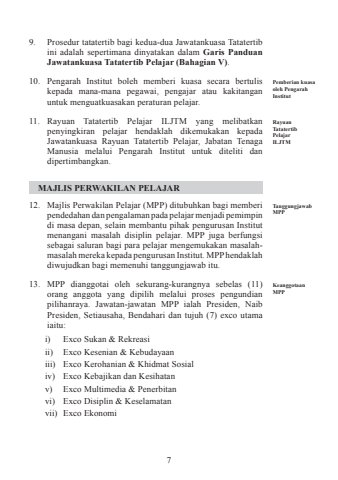 7Pemberian kuasa oleh Pengarah InstitutRayuan Tatatertib Pelajar ILJTMKeanggotaan MPPTanggungjawab MPP9. Prosedur tatatertib bagi kedua-dua Jawatankuasa Tatatertib ini adalah sepertimana dinyatakan dalam Garis Panduan Jawatankuasa Tatatertib Pelajar (Bahagian V). 10. Pengarah Institut boleh memberi kuasa secara bertulis kepada mana-mana pegawai, pengajar atau kakitangan untuk menguatkuasakan peraturan pelajar. 11. Rayuan Tatatertib Pelajar ILJTM yang melibatkan penyingkiran pelajar hendaklah dikemukakan kepada Jawatankuasa Rayuan Tatatertib Pelajar, Jabatan Tenaga Manusia melalui Pengarah Institut untuk diteliti dan dipertimbangkan. MAJLIS PERWAKILAN PELAJAR 12. Majlis Perwakilan Pelajar (MPP) ditubuhkan bagi memberi pendedahan dan pengalaman pada pelajar menjadi pemimpin di masa depan, selain membantu pihak pengurusan Institut menangani masalah disiplin pelajar. MPP juga berfungsi sebagai saluran bagi para pelajar mengemukakan masalahmasalah mereka kepada pengurusan Institut. MPP hendaklah diwujudkan bagi memenuhi tanggungjawab itu. 13. MPP dianggotai oleh sekurang-kurangnya sebelas (11) orang anggota yang dipilih melalui proses pengundian pilihanraya. Jawatan-jawatan MPP ialah Presiden, Naib Presiden, Setiausaha, Bendahari dan tujuh (7) exco utama iaitu:i) Exco Sukan & Rekreasiii) Exco Kesenian & Kebudayaaniii) Exco Kerohanian & Khidmat Sosialiv) Exco Kebajikan dan Kesihatanv) Exco Multimedia & Penerbitan vi) Exco Disiplin & Keselamatan vii) Exco Ekonomi