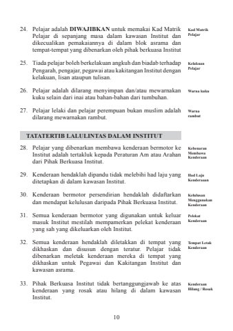 1024. Pelajar adalah DIWAJIBKAN untuk memakai Kad Matrik Pelajar di sepanjang masa dalam kawasan Institut dan dikecualikan pemakaiannya di dalam blok asrama dan tempat-tempat yang dibenarkan oleh pihak berkuasa Institut 25. Tiada pelajar boleh berkelakuan angkuh dan biadab terhadap Pengarah, pengajar, pegawai atau kakitangan Institut dengan kelakuan, lisan ataupun tulisan. 26. Pelajar adalah dilarang menyimpan dan/atau mewarnakan kuku selain dari inai atau bahan-bahan dari tumbuhan.27. Pelajar lelaki dan pelajar perempuan bukan muslim adalah dilarang mewarnakan rambut. TATATERTIB LALULINTAS DALAM INSTITUT28. Pelajar yang dibenarkan membawa kenderaan bermotor ke Institut adalah tertakluk kepada Peraturan Am atau Arahan dari Pihak Berkuasa Institut. 29. Kenderaan hendaklah dipandu tidak melebihi had laju yang ditetapkan di dalam kawasan Institut. 30. Kenderaan bermotor persendirian hendaklah didaftarkan dan mendapat kelulusan daripada Pihak Berkuasa Institut.31. Semua kenderaan bermotor yang digunakan untuk keluar masuk Institut mestilah mempamerkan pelekat kenderaan yang sah yang dikeluarkan oleh Institut. 32. Semua kenderaan hendaklah diletakkan di tempat yang dikhaskan dan disusun dengan teratur. Pelajar tidak dibenarkan meletak kenderaan mereka di tempat yang dikhaskan untuk Pegawai dan Kakitangan Institut dan kawasan asrama. 33. Pihak Berkuasa Institut tidak bertanggungjawab ke atas kenderaan yang rosak atau hilang di dalam kawasan Institut. Kad Matrik PelajarKelakuan PelajarWarna kukuWarna rambutKebenaran Membawa KenderaanHad Laju KenderaaanKelulusan Menggunakan KenderaanPelekat KenderaanTempat Letak KenderaanKenderaan Hilang / Rosak