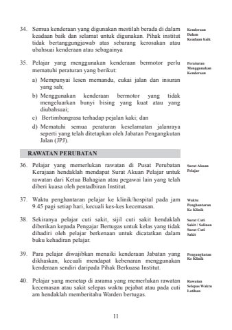 1134. Semua kenderaan yang digunakan mestilah berada di dalam keadaan baik dan selamat untuk digunakan. Pihak institut tidak bertanggungjawab atas sebarang kerosakan atau ubahsuai kenderaan atau sebagainya 35. Pelajar yang menggunakan kenderaan bermotor perlu mematuhi peraturan yang berikut: a) Mempunyai lesen memandu, cukai jalan dan insuran yang sah;b) Menggunakan kenderaan bermotor yang tidak mengeluarkan bunyi bising yang kuat atau yang diubahsuai;c) Bertimbangrasa terhadap pejalan kaki; dand) Mematuhi semua peraturan keselamatan jalanraya seperti yang telah ditetapkan oleh Jabatan Pengangkutan Jalan (JPJ). RAWATAN PERUBATAN 36. Pelajar yang memerlukan rawatan di Pusat Perubatan Kerajaan hendaklah mendapat Surat Akuan Pelajar untuk rawatan dari Ketua Bahagian atau pegawai lain yang telah diberi kuasa oleh pentadbiran Institut. 37. Waktu penghantaran pelajar ke klinik/hospital pada jam 9.45 pagi setiap hari, kecuali kes-kes kecemasan. 38. Sekiranya pelajar cuti sakit, sijil cuti sakit hendaklah diberikan kepada Pengajar Bertugas untuk kelas yang tidak dihadiri oleh pelajar berkenaan untuk dicatatkan dalam buku kehadiran pelajar. 39. Para pelajar diwajibkan menaiki kenderaan Jabatan yang dikhaskan, kecuali mendapat kebenaran menggunakan kenderaan sendiri daripada Pihak Berkuasa Institut.40. Pelajar yang menetap di asrama yang memerlukan rawatan kecemasan atau sakit selepas waktu pejabat atau pada cuti am hendaklah memberitahu Warden bertugas. Kenderaan Dalam Keadaan baikPeraturan Menggunakan KenderaanSurat Akuan PelajarWaktu Penghantaran Ke KlinikSurat Cuti Sakit / Salinan Surat Cuti SakitPengangkutan Ke KlinikRawatan Selepas Waktu Latihan