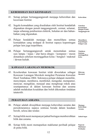 12 KEBERSIHAN DAN KEINDAHAN 41. Setiap pelajar bertanggungjawab menjaga kebersihan dan keceriaan Institut. 42. Segala kemudahan yang disediakan oleh Institut hendaklah digunakan dengan penuh tanggungjawab, cermat, selamat, tanpa sebarang pembaziran elektrik, bekalan air dan bahanbahan yang digunakan. 43. Pelajar hendaklah menjaga dan memelihara semua kemudahan yang terdapat di Institut supaya kepentingan pelajar lain juga terpelihara. 44. Pelajar bertanggungjawab untuk menentukan semua suis lampu / kipas / alat hawa dingin / komputer / mesin dimatikan sebelum meninggalkan kelas / bengkel / makmal / dewan kuliah. KAWASAN LARANGAN MEROKOK 45. Keseluruhan kawasan Institut telah diwartakan sebagai Kawasan Larangan Merokok mengikut Peraturan Kawalan Hasil Tembakau 2004. Sekiranya pelajar didapati memiliki, menyimpan, membawa, membekal, mengedar, mempamer, menyiar, mengiklan, menjual atau menghisap rokok atau seumpamanya di dalam kawasan Institut dan asrama adalah melakukan kesalahan dan boleh dikenakan tindakan tatatertib. PERATURAN ASRAMA 46. Pelajar adalah diwajibkan menjaga kebersihan asrama dan persekitarannya supaya sentiasa berada dalam keadaan bersih, selesa dan teratur. 47. Setiap bilik mesti mempunyai jadual bertugas membersihkan bilik dan asrama. 48. Setiap bilik mesti memaparkan maklumat peribadi pelajar di pintu bilik. KebersihanGunakan Kemudahan Dengan Penuh TanggungjawabMemelihara Kepentingan Pelajar LainTindakan Sebelum meninggalkan KelasDilarang MerokokMenjaga Kebersihan AsramaJadual tugasPaparan Maklumat Peribadai