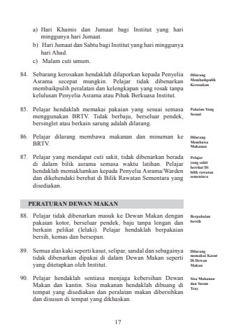 17a) Hari Khamis dan Jumaat bagi Institut yang hari minggunya hari Jumaat.b) Hari Jumaat dan Sabtu bagi Institut yang hari minggunya hari Ahad.c) Malam cuti umum.84. Sebarang kerosakan hendaklah dilaporkan kepada Penyelia Asrama secepat mungkin. Pelajar tidak dibenarkan membaikpulih peralatan dan kelengkapan yang rosak tanpa kelulusan Penyelia Asrama atau Pihak Berkuasa Institut.85. Pelajar hendaklah memakai pakaian yang sesuai semasa menggunakan BRTV. Tidak berbaju, berseluar pendek, bersinglet atau berkain sarung adalah dilarang. 86. Pelajar dilarang membawa makanan dan minuman ke BRTV. 87. Pelajar yang mendapat cuti sakit, tidak dibenarkan berada di dalam bilik asrama semasa waktu latihan. Pelajar hendaklah memaklumkan kepada Penyelia Asrama/Warden dan dikehendaki berehat di Bilik Rawatan Sementara yang disediakan. PERATURAN DEWAN MAKAN 88. Pelajar tidak dibenarkan masuk ke Dewan Makan dengan pakaian kotor, berseluar pendek, baju tanpa lengan dan berkain pelikat (lelaki). Pelajar hendaklah berpakaian bersih, kemas dan bersopan. 89. Semua alas kaki seperti kasut, selipar, sandal dan sebagainya tidak dibenarkan dipakai di dalam Dewan Makan seperti yang ditetapkan oleh Institut. 90. Pelajar hendaklah sentiasa menjaga kebersihan Dewan Makan dan kantin. Sisa makanan hendaklah dibuang di tempat yang disediakan dan peralatan makan dibersihkan dan disusun di tempat yang dikhaskan. Dilarang Membaikpulih KerosakanPakaian Yang SesuaiBerpakaian bersihDilarang Membawa MakananDilarang memakai Kasut Di Dewan MakanPelajar yang sakit berehat Di bilik rawatan sementaraSisa Makanan dan Susun Tray
