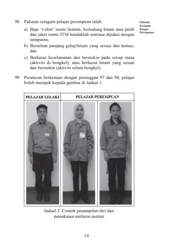 1998. Pakaian seragam pelajar perempuan ialah:a) Baju %u2018t-shirt%u2019 rasmi Institut, bertudung hitam atau putih dan jaket rasmi JTM hendaklah sentiasa dipakai dengan sempurna;b) Berseluar panjang gelap/hitam yang sesuai dan kemas; danc) Berkasut keselamatan dan berstokin pada setiap masa (aktiviti di bengkel); atau berkasut hitam yang sesuai dan berstokin (aktiviti selain bengkel).99. Peraturan berkenaan dengan perenggan 97 dan 98, pelajar boleh merujuk kepada gambar di Jadual 1. Jadual 2: Contoh penampilan diri dan pemakaian uniform institutPakaian Seragam Pelajar Perempuan