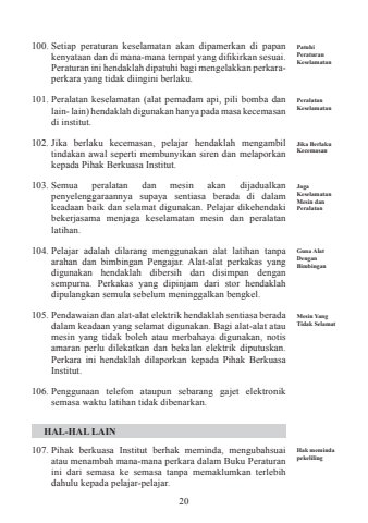 20100. Setiap peraturan keselamatan akan dipamerkan di papan kenyataan dan di mana-mana tempat yang difikirkan sesuai. Peraturan ini hendaklah dipatuhi bagi mengelakkan perkaraperkara yang tidak diingini berlaku. 101. Peralatan keselamatan (alat pemadam api, pili bomba dan lain- lain) hendaklah digunakan hanya pada masa kecemasan di institut. 102. Jika berlaku kecemasan, pelajar hendaklah mengambil tindakan awal seperti membunyikan siren dan melaporkan kepada Pihak Berkuasa Institut. 103. Semua peralatan dan mesin akan dijadualkan penyelenggaraannya supaya sentiasa berada di dalam keadaan baik dan selamat digunakan. Pelajar dikehendaki bekerjasama menjaga keselamatan mesin dan peralatan latihan. 104. Pelajar adalah dilarang menggunakan alat latihan tanpa arahan dan bimbingan Pengajar. Alat-alat perkakas yang digunakan hendaklah dibersih dan disimpan dengan sempurna. Perkakas yang dipinjam dari stor hendaklah dipulangkan semula sebelum meninggalkan bengkel.105. Pendawaian dan alat-alat elektrik hendaklah sentiasa berada dalam keadaan yang selamat digunakan. Bagi alat-alat atau mesin yang tidak boleh atau merbahaya digunakan, notis amaran perlu dilekatkan dan bekalan elektrik diputuskan. Perkara ini hendaklah dilaporkan kepada Pihak Berkuasa Institut. 106. Penggunaan telefon ataupun sebarang gajet elektronik semasa waktu latihan tidak dibenarkan. HAL-HAL LAIN107. Pihak berkuasa Institut berhak meminda, mengubahsuai atau menambah mana-mana perkara dalam Buku Peraturan ini dari semasa ke semasa tanpa memaklumkan terlebih dahulu kepada pelajar-pelajar. Peralatan KeselamatanJika Berlaku KecemasanGuna Alat Dengan BimbinganJaga Keselamatan Mesin dan PeralatanMesin Yang Tidak SelamatHak meminda pekelilingPatuhi Peraturan Keselamatan