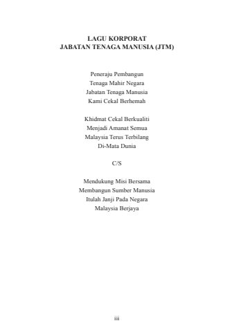 iiiLAGU KORPORAT JABATAN TENAGA MANUSIA (JTM)Peneraju PembangunTenaga Mahir NegaraJabatan Tenaga ManusiaKami Cekal BerhemahKhidmat Cekal BerkualitiMenjadi Amanat SemuaMalaysia Terus TerbilangDi-Mata DuniaC/SMendukung Misi BersamaMembangun Sumber ManusiaItulah Janji Pada NegaraMalaysia Berjaya