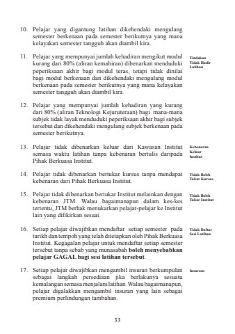 3310. Pelajar yang digantung latihan dikehendaki mengulang semester berkenaan pada semester berikutnya yang mana kelayakan semester tangguh akan diambil kira. 11. Pelajar yang mempunyai jumlah kehadiran mengikut modul kurang dari 80% (aliran kemahiran) dibenarkan menduduki peperiksaan akhir bagi modul teras, tetapi tidak dinilai bagi modul berkenaan dan dikehendaki mengulang modul berkenaan pada semester berikutnya yang mana kelayakan semester tangguh akan diambil kira. 12. Pelajar yang mempunyai jumlah kehadiran yang kurang dari 80% (aliran Teknologi Kejuruteraan) bagi mana-mana subjek tidak layak menduduki peperiksaan akhir bagi subjek tersebut dan dikehendaki mengulang subjek berkenaan pada semester berikutnya. 13. Pelajar tidak dibenarkan keluar dari Kawasan Institut semasa waktu latihan tanpa kebenaran bertulis daripada Pihak Berkuasa Institut. 14. Pelajar tidak dibenarkan bertukar kursus tanpa mendapat kebenaran dari Pihak Berkuasa Institut. 15. Pelajar tidak dibenarkan bertukar Institut melainkan dengan kebenaran JTM. Walau bagaimanapun dalam kes-kes tertentu, JTM berhak menukarkan pelajar-pelajar ke Institut lain yang difikirkan sesuai.16. Setiap pelajar diwajibkan mendaftar setiap semester pada tarikh dan tempoh yang telah ditetapkan oleh Pihak Berkuasa Institut. Kegagalan pelajar untuk mendaftar setiap semester tersebut tanpa sebab yang munasabah boleh menyebabkan pelajar GAGAL bagi sesi latihan tersebut. 17. Setiap pelajar diwajibkan mengambil insuran berkumpulan sebagai langkah persediaan jika berlakunya sesuatu kemalangan semasa menjalani latihan. Walau bagaimanapun, pelajar digalakkan mengambil insuran yang lain sebagai premium perlindungan tambahan. Tindakan Tidak Hadir LatihanKebenaran Keluar InstitutTidak Boleh Tukar InstitutTidak Boleh Tukar KursusTidak Daftar Sesi LatihanInsurans