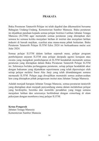 ivPRAKATABuku Peraturan Tatatertib Pelajar ini telah digubal dan dikemaskini bersamaBahagian Undang-Undang, Kementerian Sumber Manusia. Buku peraturanini dijadikan panduan kepada semua pelajar Institusi Latihan Jabatan TenagaManusia (ILJTM) agar mematuhi semua peraturan yang ditetapkan darisemasa ke semasa ketika menjalani latihan di institut dan menjalani latihanindustri di bawah majikan, syarikat atau mana-mana pihak berkaitan. BukuPeraturan Tatatertib Pelajar ILJTM Edisi 2024 ini berkuatkuasa mulai sesiJulai 2024.Semua pelajar ILJTM dalam latihan sepenuh masa, pelajar programpembelajaran anjuran ILJTM atau pelajar daripada agensi kerajaan atauswasta yang mengikuti pembelajaran di ILJTM hendaklah mematuhi semuaperaturan yang ditetapkan dalam Buku Peraturan Tatatertib Pelajar ILJTMini. Sekiranya berlaku perlanggaran peraturan, setiap pelajar hendaklah akurdengan hukuman yang dijatuhkan sepertimana yang telah dipersetujui olehsetiap pelajar melalui Surat Aku Janji yang telah ditandatangani semasamemasuki ILJTM. Pelajar juga diwajibkan mematuhi semua arahan-arahanlain yang ditetapkan pihak pengurusan insitut atau Jabatan Tenaga Manusia.Adalah menjadi harapan Jabatan Tenaga Manusia, semua peraturan tatatertibyang ditetapkan akan menjadi penyumbang utama dalam melahirkan pelajaryang berdisiplin, beretika dan memiliki peradaban yang tinggi semasamenjalani latihan dan seterusnya berkhidmat dengan cemerlang di alampekerjaan dengan membawa imej pelajar ILJTM.Ketua PengarahJabatan Tenaga ManusiaKementerian Sumber Manusia