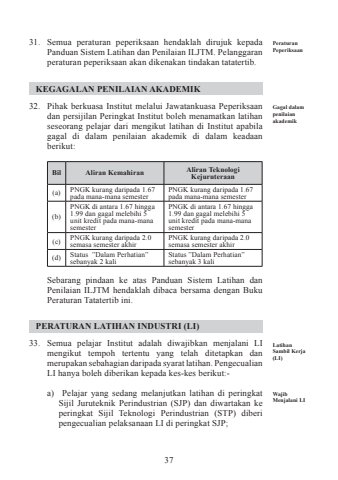 3731. Semua peraturan peperiksaan hendaklah dirujuk kepada Panduan Sistem Latihan dan Penilaian ILJTM. Pelanggaran peraturan peperiksaan akan dikenakan tindakan tatatertib.KEGAGALAN PENILAIAN AKADEMIK 32. Pihak berkuasa Institut melalui Jawatankuasa Peperiksaan dan persijilan Peringkat Institut boleh menamatkan latihan seseorang pelajar dari mengikut latihan di Institut apabila gagal di dalam penilaian akademik di dalam keadaan berikut: Bil Aliran Kemahiran Aliran Teknologi Kejuruteraan(a) PNGK kurang daripada 1.67 pada mana-mana semesterPNGK kurang daripada 1.67 pada mana-mana semester(b)PNGK di antara 1.67 hingga 1.99 dan gagal melebihi 5 unit kredit pada mana-mana semesterPNGK di antara 1.67 hingga 1.99 dan gagal melebihi 5 unit kredit pada mana-mana semester(c) PNGK kurang daripada 2.0 semasa semester akhirPNGK kurang daripada 2.0 semasa semester akhir(d) Status %u201dDalam Perhatian%u201d sebanyak 2 kaliStatus %u201dDalam Perhatian%u201d sebanyak 3 kaliSebarang pindaan ke atas Panduan Sistem Latihan dan Penilaian ILJTM hendaklah dibaca bersama dengan Buku Peraturan Tatatertib ini. PERATURAN LATIHAN INDUSTRI (LI) 33. Semua pelajar Institut adalah diwajibkan menjalani LI mengikut tempoh tertentu yang telah ditetapkan dan merupakan sebahagian daripada syarat latihan. Pengecualian LI hanya boleh diberikan kepada kes-kes berikut:- a) Pelajar yang sedang melanjutkan latihan di peringkat Sijil Juruteknik Perindustrian (SJP) dan diwartakan ke peringkat Sijil Teknologi Perindustrian (STP) diberi pengecualian pelaksanaan LI di peringkat SJP;Latihan Sambil Kerja (LI)Wajib Menjalani LIGagal dalam penilaian akademikPeraturan Peperiksaan