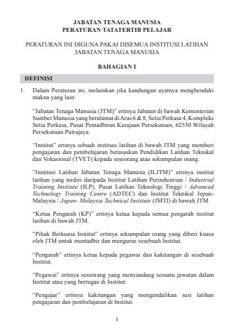 1JABATAN TENAGA MANUSIAPERATURAN TATATERTIB PELAJARPERATURAN INI DIGUNA PAKAI DISEMUA INSTITUSI LATIHANJABATAN TENAGA MANUSIABAHAGIAN IDEFINISI1. Dalam Peraturan ini, melainkan jika kandungan ayatnya menghendaki makna yang lain:%u201cJabatan Tenaga Manusia (JTM)%u201d ertinya Jabatan di bawah Kementerian Sumber Manusia yang beralamat di Aras 6 & 8, Setia Perkasa 4, Kompleks Setia Perkasa, Pusat Pentadbiran Kerajaan Persekutuan, 62530 Wilayah Persekutuan Putrajaya.%u201cInstitut%u201d ertinya sebuah institusi latihan di bawah JTM yang memberi pengajaran dan pembelajaran berasaskan Pendidikan Latihan Teknikal dan Vokasional (TVET) kepada seseorang atau sekumpulan orang.%u201cInstitusi Latihan Jabatan Tenaga Manusia (ILJTM)%u201d ertinya institut latihan yang terdiri daripada Institut Latihan Perindustrian / Industrial Training Institute (ILP), Pusat Latihan Teknologi Tinggi / Advanced Technology Training Centre (ADTEC) dan Institut Teknikal JepunMalaysia / Japan- Malaysia Technical Institute (JMTI) di bawah JTM.%u201cKetua Pengarah (KP)%u201d ertinya ketua kepada semua pengarah institut latihan di bawah JTM.%u201cPihak Berkuasa Institut%u201d ertinya sekumpulan orang yang diberi kuasa oleh JTM untuk mentadbir dan mengurus sesebuah Institut.%u201cPengarah%u201d ertinya ketua kepada pegawai dan kakitangan di sesebuah Institut.%u201cPegawai%u201d ertinya seseorang yang menyandang sesuatu jawatan dalam Institut atau yang bertugas di Institut.%u201cPengajar%u201d ertinya kakitangan yang mengendalikan sesi latihan pengajaran dan pembelajaran di Institut.
