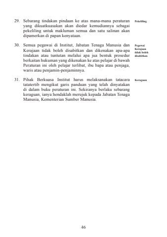 4629. Sebarang tindakan pindaan ke atas mana-mana peraturanyang dikuatkuasakan akan diedar kemudiannya sebagaipekeliling untuk makluman semua dan satu salinan akandipamerkan di papan kenyataan.30. Semua pegawai di Institut, Jabatan Tenaga Manusia danKerajaan tidak boleh disabitkan dan dikenakan apa-apatindakan atau tuntutan melalui apa jua bentuk prosedurberkaitan hukuman yang dikenakan ke atas pelajar di bawahPeraturan ini oleh pelajar terlibat, ibu bapa atau penjaga,waris atau penjamin-penjaminnya.31. Pihak Berkuasa Institut harus melaksanakan tatacaratatatertib mengikut garis panduan yang telah dinyatakandi dalam buku peraturan ini. Sekiranya berlaku sebarangkeraguan, ianya hendaklah merujuk kepada Jabatan TenagaManusia, Kementerian Sumber Manusia.Pegawai Kerajaan tidak boleh disabitkanKeraguanPekeliling