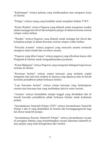 2%u201cKakitangan%u201d ertinya pekerja yang melaksanakan atau mengurus kerja di Institut.%u201cPelajar%u201d ertinya orang yang berdaftar untuk menjalani latihan TVET.%u201cKetua Warden%u201d ertinya Pegawai yang dilantik untuk mengetuai warden dalam menjaga hal ehwal dan kebajikan pelajar di dalam kawasan institut selepas waktu latihan.%u201cWarden%u201d ertinya Pegawai yang dilantik untuk menjaga hal ehwal dan kebajikan pelajar di dalam kawasan institut selepas waktu latihan.%u201cPenyelia Asrama%u201d ertinya pegawai yang menyelia asrama termasuk mengurus harta modal dan inventori asrama.%u201cPegawai yang diberi kuasa%u201d ertinya pegawai yang diberikan kuasa oleh Pengarah di Institut untuk menguatkuasakan peraturan.%u201cKetua Bahagian%u201d ertinya Pegawai yang mengetuai bahagian bagi kursus tertentu di Institut.%u201cKawasan Institut%u201d ertinya semua kawasan yang meliputi segala bangunan atau lain-lain struktur di atasnya yang dipunyai atau di bawah kawalan pentadbiran pihak berkuasa Institut.%u201cLuar Kawasan Institut%u201d ertinya semua kawasan yang berhampiran institut atau kawasan luar yang melibatkan aktiviti rasmi institut.%u201cAsrama%u201d ertinya kemudahan tempat tinggal yang disediakan dan di bawah kawalan pentadbiran pihak berkuasa Institut untuk kediaman pelajar.%u201cJawatankuasa Tatatertib Pelajar (JTP)%u201d ertinya Jawatankuasa Tatatertib Pelajar I dan II yang ditubuhkan di Institut dan bertanggungjawab bagi hal ehwal tatatertib pelajar.%u201cJawatankuasa Rayuan Tatatertib Pelajar%u201d ertinya jawatankuasa rayuan di peringkat Jabatan yang menimbangkan rayuan hukuman tatatertib ke atas pelajar yang telah disingkirkan dari Institut.