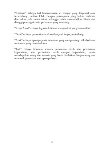 4%u201cKhalwat%u201d ertinya hal berdua-duaan di tempat yang terpencil atau tersembunyi, antara lelaki dengan perempuan yang bukan mahram dan bukan pula suami isteri, sehingga boleh menimbulkan fitnah dan dianggap sebagai suatu perbuatan yang sumbang.%u201cKerja Amal%u201d ertinya tugasan khidmat masyarakat yang bermanfaat.%u201cDron%u201d ertinya pesawat udara kawalan jauh tanpa juruterbang.%u201cArak%u201d ertinya apa-apa jenis minuman yang mengandungi alkohol atau minuman yang memabukkan.%u201cJudi%u201d ertinya bermain sesuatu permainan nasib atau permainan kepandaian, atau permainan nasib campur kepandaian, untuk mendapatkan wang atau sesuatu yang boleh dinilaikan dengan wang dan termasuk peraturan atau apa-apa loteri.