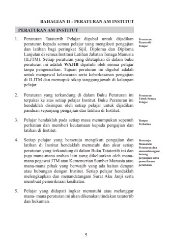 5Peraturan Tatatertib PelajarPeraturan Untuk Semua PelajarTumpu PerhatianBersetuju Mematuhi Peraturan dan menandatangani borang perjanjian serta pemeriksaan perubatan BAHAGIAN II - PERATURAN AM INSTITUTPERATURAN AM INSTITUT1. Peraturan Tatatertib Pelajar digubal untuk dijadikan peraturan kepada semua pelajar yang mengikuti pengajian dan latihan bagi peringkat Sijil, Diploma dan Diploma Lanjutan di semua Institusi Latihan Jabatan Tenaga Manusia (ILJTM). Setiap peraturan yang ditetapkan di dalam buku peraturan ini adalah WAJIB dipatuhi oleh semua pelajar tanpa pengecualian. Tujuan peraturan ini digubal adalah untuk mengawal kelancaran serta keberkesanan pengajian di ILJTM dan memupuk sikap tanggungjawab di kalangan pelajar. 2. Peraturan yang terkandung di dalam Buku Peraturan ini terpakai ke atas setiap pelajar Institut. Buku Peraturan ini hendaklah disimpan oleh setiap pelajar untuk dijadikan panduan sepanjang pengajian dan latihan di Institut.3. Pelajar hendaklah pada setiap masa menumpukan sepenuh perhatian dan memberi keutamaan kepada pengajian dan latihan di Institut. 4. Setiap pelajar yang bersetuju mengikuti pengajian dan latihan di Institut hendaklah mematuhi dan akur setiap peraturan yang terkandung di dalam Buku Tatatertib ini dan juga mana-mana arahan lain yang dikeluarkan oleh manamana pegawai JTM atau Kementerian Sumber Manusia atau mana-mana pihak yang berwajib yang ada kaitan dengan atau hubungan dengan Institut. Setiap pelajar hendaklah melengkapkan dan menandatangani Surat Aku Janji serta membuat pemeriksaan kesihatan. 5. Pelajar yang didapati ingkar mematuhi atau melanggar mana- mana peraturan ini akan dikenakan tindakan tatatertib dan hukuman.